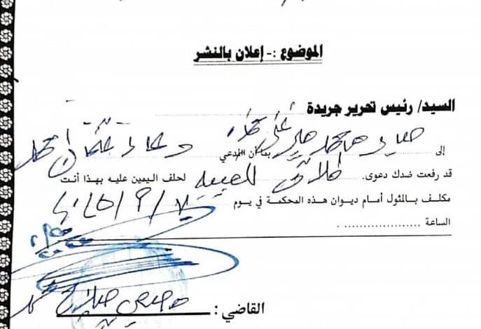تعلن محكمة البر الشرقي العامة بورتسودان المدعى عليه صابر محمد ميرغني حمذه للمثول أمامها يوم 2025/9/10 لحلف اليمين في الدعوى المقدمة من المدعي دعاء عثمان أحمد التي رفعت عليك دعوى طلاق للغيبة.