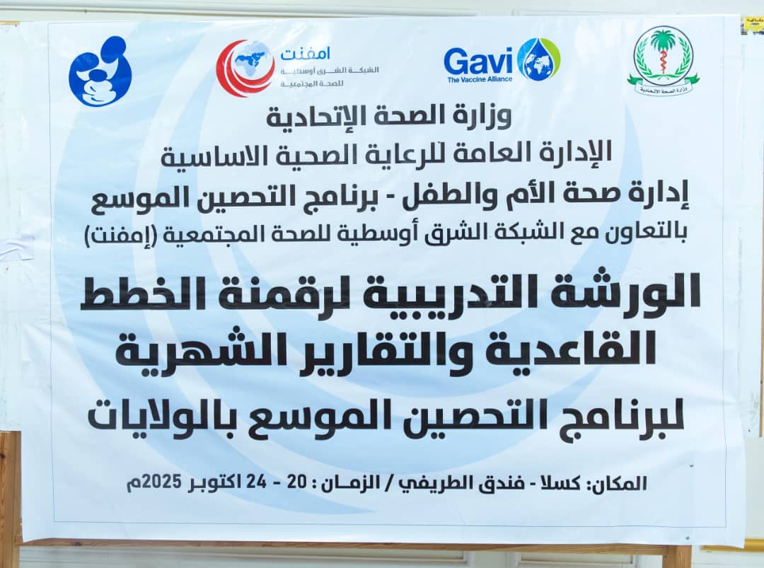اختتم برنامج التحصين الموسع، الجمعة بقاعة الريح الطريفي بمدينة كسلا الورشة التدريبية لرقمنة الخطط القاعدية والتقارير الشهرية للبرنامج بالولايات، بالتعاون مع الشبكة الشرق أوسطية للصحة المجتمعية،بحضور المدرب من الشبكة محمد عباس.