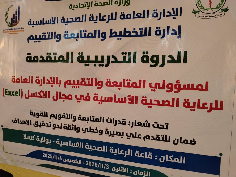 واشاد مدير الإدارة العامة للرعاية الصحية الأساسية بالصحة الاتحادية د. مصعب صديق في افتتاحية الدورة، بمنسوبي المتابعة والتقييم وعملهم خلال الفترة السابقة خاصة سنوات الحرب، مؤكدا ان الدورة ستسهم بشكل كبير في تطوير التقارير والتحليل،خاصة وان الإدارة شرعت في إعداد خطتها للعام 2026م، وكذلك المساهمة في إعداد الخطة الاستراتيجية للوزارة لمرحلة التعافي، وأضاف “على ثقة ان الجميع على قدر المسؤولية”،فيما وجه بتنفيذ دورة أخرى متقدمة.