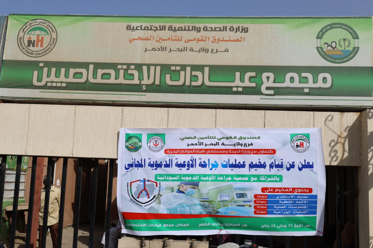 شرع فرع الصندوق القومي للتأمين الصحي بولاية البحر الاحمر في إنفاذ المخيم العلاجي المجاني لجراحة الأوعية الدموية بالتعاون مع وزارة الصحة بالولاية ومستشفى هيئة الموانئ البحرية وجمعية جراحة الأوعية الدموية السودانية.