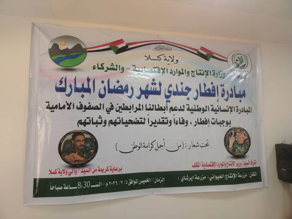 في بادرة هي الاولي من نوعها بالمؤسسات دشنت وزارة الانتاج مبادرة نوعية لافطار جندي تحترشعار (من اجل كرامة الوطن وبحضور عدد من القيادات المجتمعية والنظامية والشركاء .