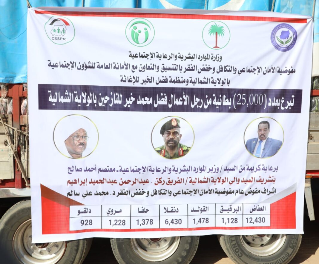 ودعا خلال تدشين قافلة محملة ب250 ألف بطانية للنازحين بالشمالية اليوم (الاثنين) بدعم من رجل البر والإحسان فضل محمد خير،دعا الخيرين للتدافع بالمساهمة في دعم النازحين من تخفيف المعاناة لاسيما في ظل زيادة نسب الفقر والحوجة الكبيرة التي تفوق إمكانيات الدولة في الوقت الراهن .