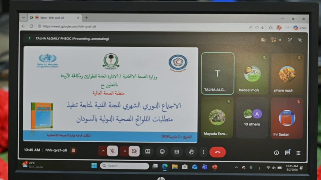 عقدت إدارة اللوائح الصحية الدولية بالإدارة العامة للطوارئ الصحية ومكافحة الاوبئة، اليوم بالقاعة الكبرى بمقر وزارة الصحة الاتحادية بالخرطوم، الاجتماع الدوري الشهري لمتابعة تنفيذ متطلبات اللوائح الصحية الدولية، بالتعاون مع منظمة الصحة العالمية، وحضور الجهات المختصة.