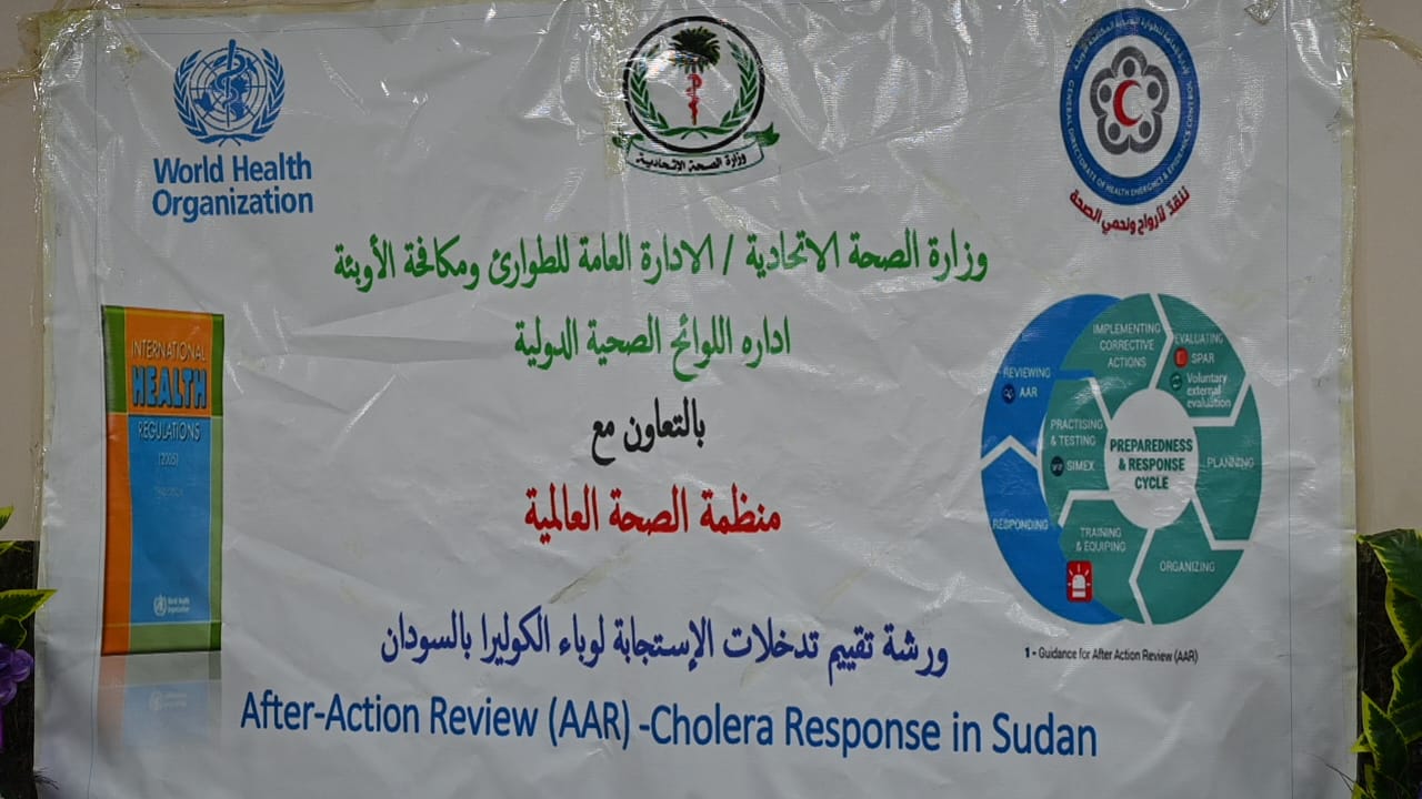 نظمت إدارة اللوائح الصحية الدولية بالإدارة العامة للطوارئ الصحية ومكافحة الاوبئة، وبالتعاون مع منظمة الصحة العالمية، اليوم بقاعة زهرة الروضة بأمدرمان، ورشة تقييم تدخلات الاستجابة لوباء الكوليرا،بمشاركة عدد من الولايات والمنظمات، وتستمر حتى بعد غدٍ( الخميس).