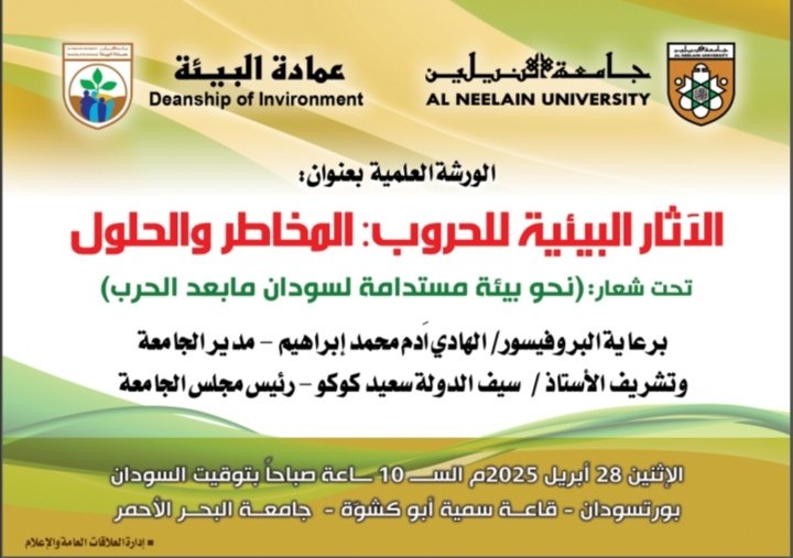 تنطلق يالعاصمه الادارية بورتسودان الاثنين المقبل فعاليات ورشة العمل التي تنظمها عمادة البيئة بجامعة النيلين تحت عنوان “الآثار البيئية للحرب ..المخاطر والحلول” وتحمل شعار (نحو بيئة مستدامة لسودان ما بعد الحرب) .