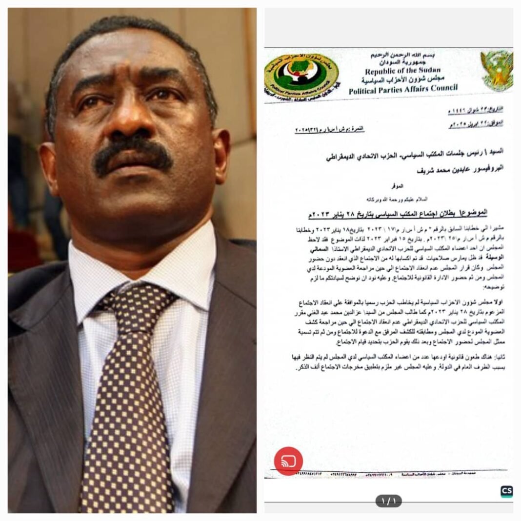 ابطل مجلس شؤون الاحزاب السياسية اجتماعا للمكتب السياسي للحزب الاتحادي الديمقراطي عقد فى نهاية يناير 2023 والذي انتخب عضو المكتب السياسي السماني الوسيلة رئيسا للمكتب.