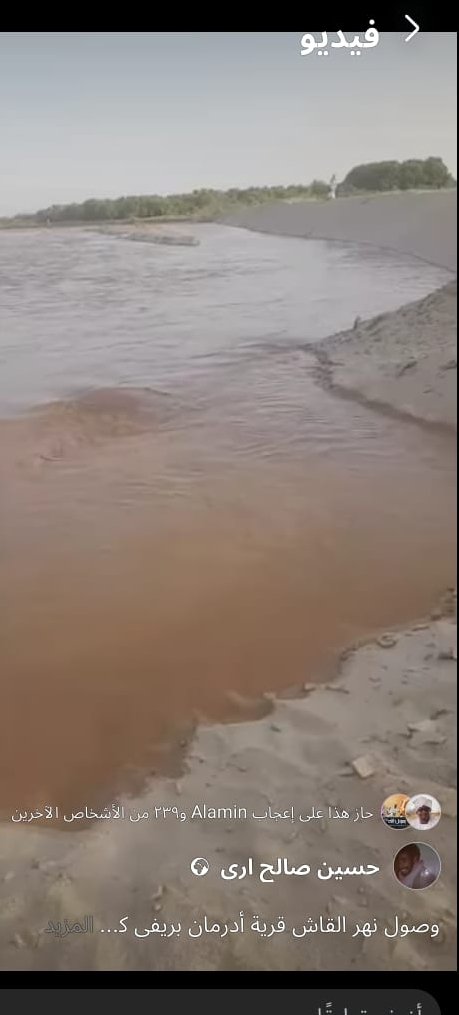 بعد الغياب.بعد الليالى المره فى حضن العذاب عاد الحبيب المنتظر عاد القاش من بين جرح السحاب وبين شهقة الأرض البكر. عاد اليوم الي منطقة ادرمان ٣٥ كليو جنوب شرق مدنية كسلا. حيث التقط المبدع حسن صالح اري صورا مجملا بها صفحته علي الفيس بوك راسما مشاهد مبهجة لحركة تدفق المياه .جسدت. منظر النهر وهو يمشي الهوينا ،في مسام رمل التوقع ليفتح الضو ويوقد شعلة الأمل في النفوس العطشى في مدنية تعتمد بشكل رسمي علي المياه الجوفية. وخلال الساعات القادمة سيخرج أنسان كسلا. لاستقبال النهر المجنون ليعيد الأمل في النفوس المحبطة وعدا وتمني ، عاد القاش وحتما ستعود هطول الأمطار ويغني شعب كسلا معاك اتبرجت غيمة وشهق جواي صوت جدول مرقت علي المطر حفيان ووو ونتخيل حلم دونك بتحقق